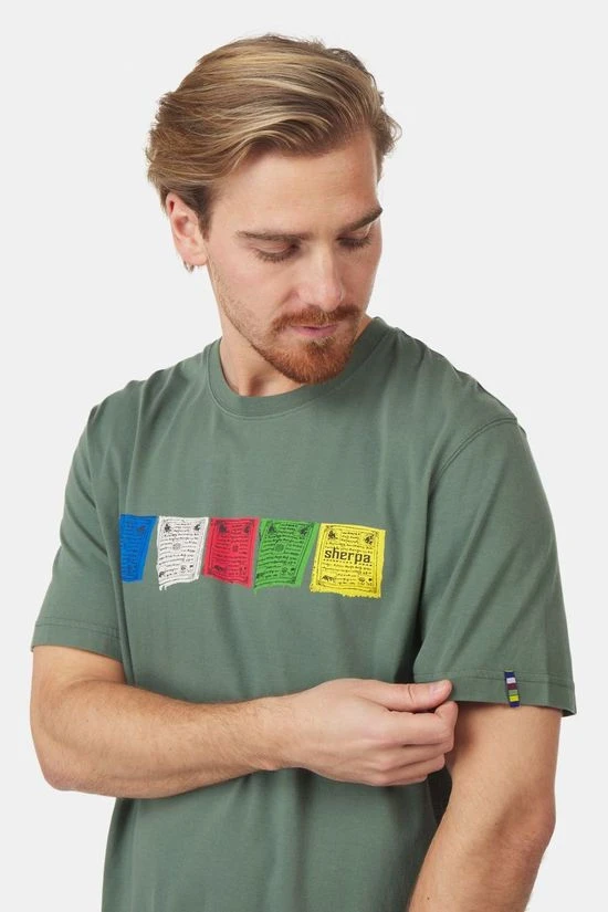 - Tarcho betekent gebedsvlag in het Tibetaans en dat is wat er op dit t-shirt afgebeeld staat.
